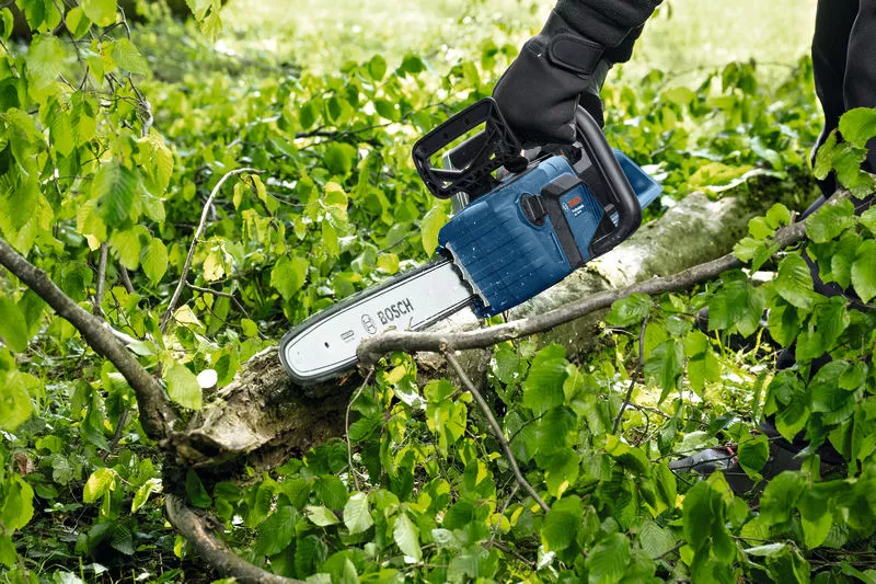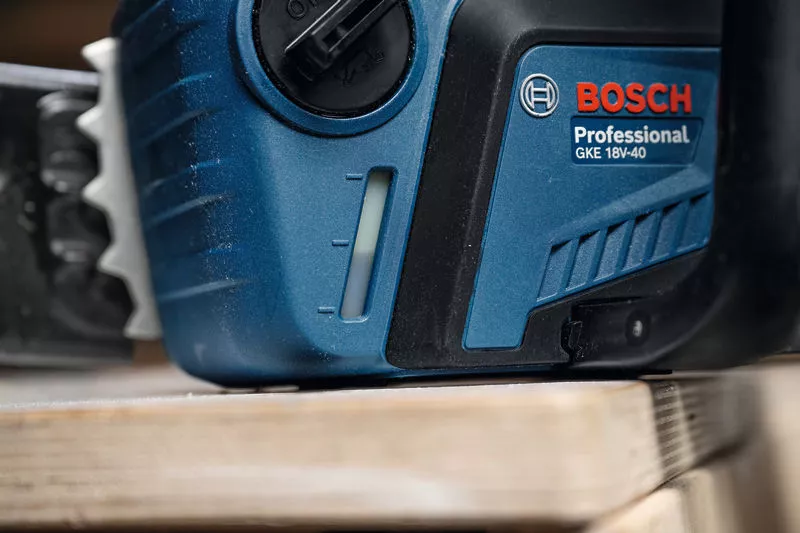 Das 40-cm-Schwert eignet sich für das Schneiden von Balken, Bauholz und dicken Ästen. Die Kettensäge ist kompatibel mit dem Bosch Professional 18V System und der AMPShare Akku-Allianz.