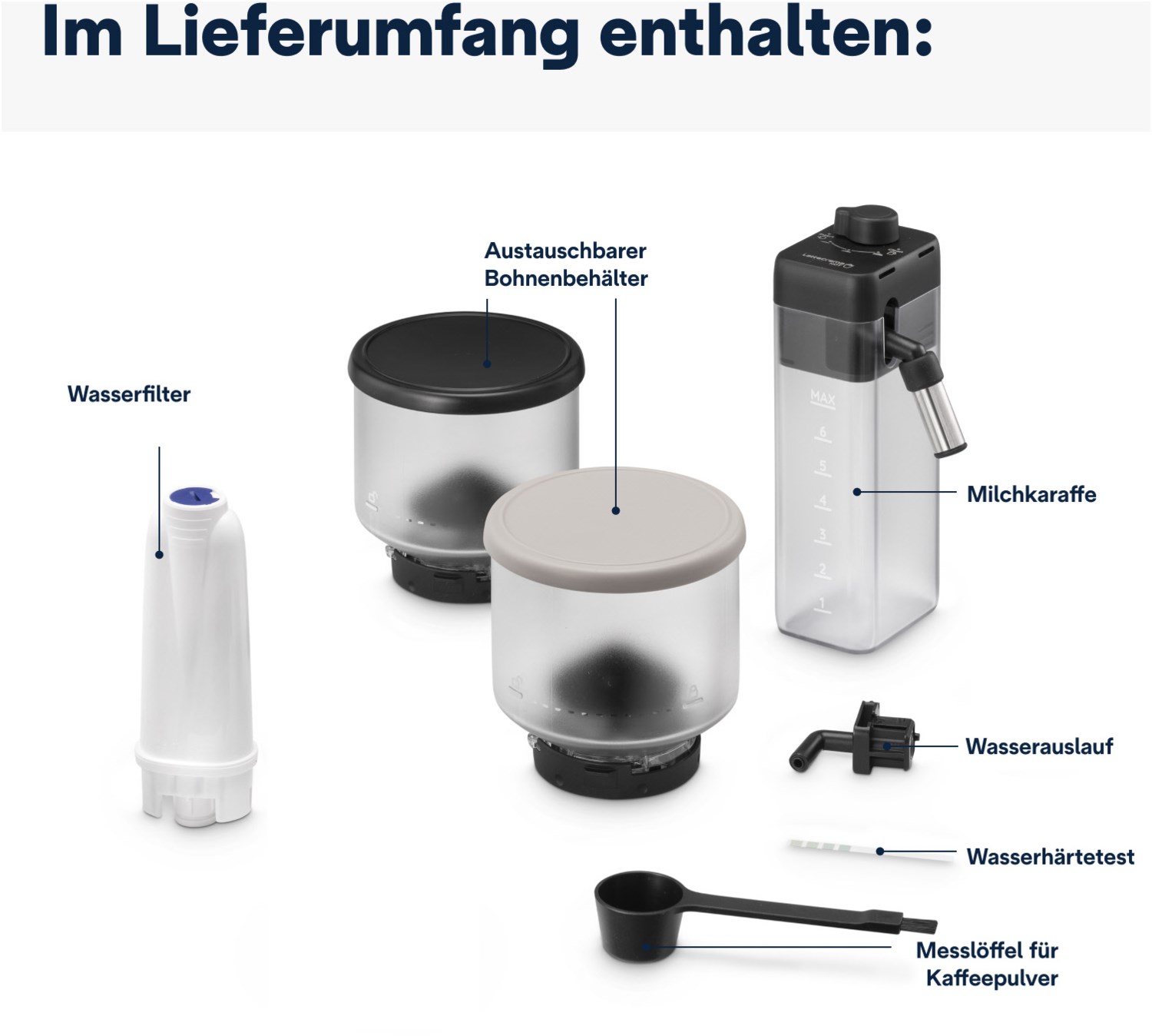 - Auswechselbarer 250 g Bohnenbehälter in Maschinenfarbe (Lieferumfang umfasst 2 Bohnenbehälter, 1 in Maschinenfarbe und 1 in Schwarz).