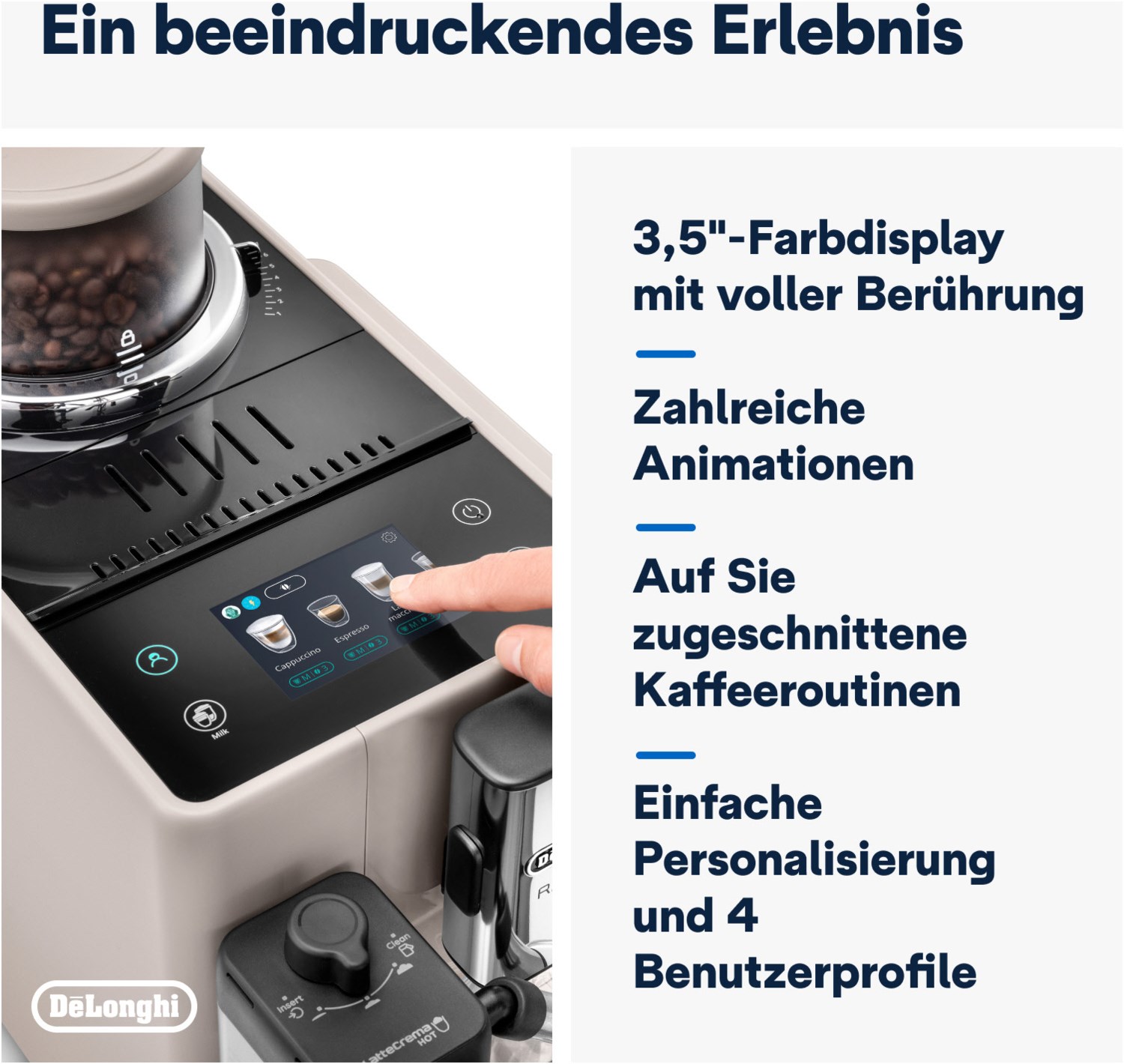 Entdecken Sie den DeLonghi Kaffeevollautomaten Rivelia Milk EXAM440.55.BG in Sand Beige – der kompakte Alleskönner mit Bean Switch System für zwei Bohnenbehälter, intuitivem 3,5-Zoll-Touchscreen und 16 Kaffeespezialitäten. Perfekte Extraktion dank Bean Adapt Technology, LatteCrema Hot für cremigen Milchschaum und personalisierte Kaffeeroutinen für jeden Geschmack. Innovatives Design, einfache Reinigung und maximale Vielfalt!