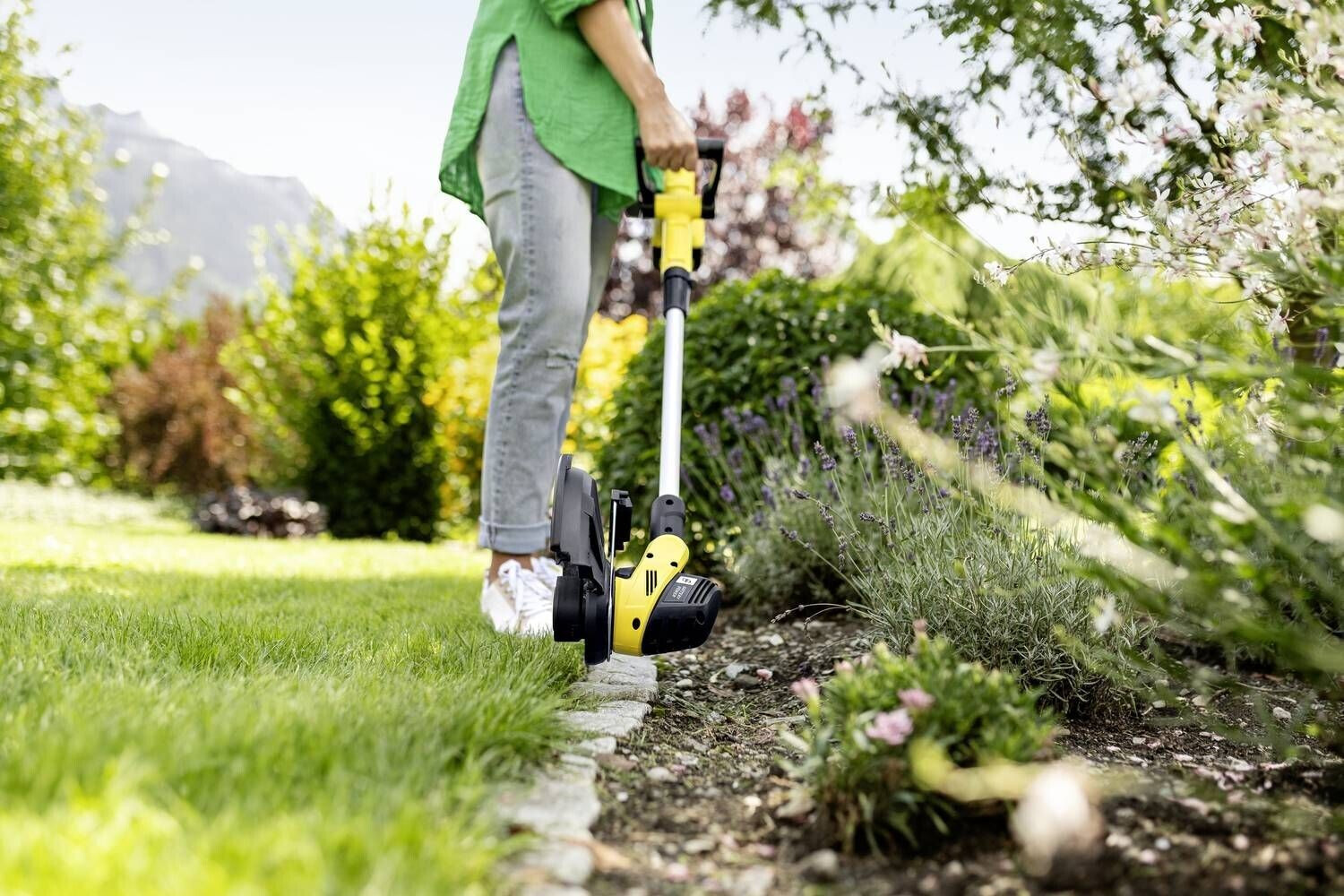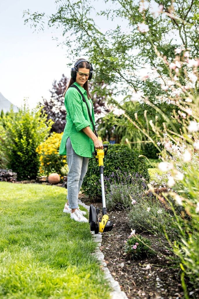 Der leistungsstarke 36-V-Motor, betrieben von zwei 18-V-Lithium-Ionen-Akkus, sorgt für effizientes und kraftvolles Trimmen – auch bei hohem Gras. Dank automatischer Fadennachstellung und gedrehtem Schneidfaden werden Rasenkanten und Flächen präzise geschnitten. Für maximalen Komfort sorgen der verstellbare Zweithandgriff und der Teleskopstiel, die eine ergonomische und rückenschonende Arbeitsposition ermöglichen. Der ausklappbare Pflanzenschutzbügel schützt Ihre Blumen und Bäume beim Trimmen sicher vor Beschädigungen. Ideal für enge Ecken, schwierige Stellen und Böschungen dank verstellbarem Neigungswinkel des Trimmerkopfs.