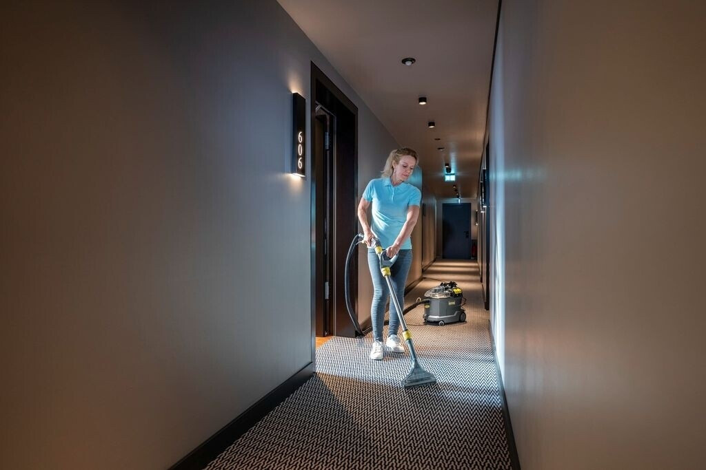 Dank seiner hervorragenden Rücksaugleistung ermöglicht der professionelle Waschsauger Puzzi 8/1 Adv von Kärcher sehr gute und hygienische Reinigungsergebnisse sowie eine schnelle Wiederbegehbarkeit von textilen Flächen. Dazu sprüht das Sprühextraktionsgerät die Reinigungslösung tief in die Textilfasern ein, saugt diese anschließend inklusive des gelösten Schmutzes wieder ab und eignet sich so perfekt zur Reinigung von Polstern, Teppichböden und anderen textilen Oberflächen. Seine robuste, kompakte Bauweise sorgt für eine lange Lebensdauer und damit eine hohe Wirtschaftlichkeit – ideal für Gebäudereiniger, im Hotel- und Gaststättengewerbe oder bei der Fahrzeuginnenreinigung. Zur besseren Sicht auf die Schmutzflotte sind der Gerätedeckel sowie die Polster- und die Bodendüse transparent gehalten. Ein Sichtfenster am Griff erhöht die Kontrollmöglichkeiten weiter wirkungsvoll. Das geringe Gewicht des Puzzi 8/1 Adv und ein ergonomischer Tragegriff ermöglichen einen einhändigen Transport. Große, per Hand oder Fuß bedienbare Drucktasten erhöhen dazu den Anwenderkomfort.
